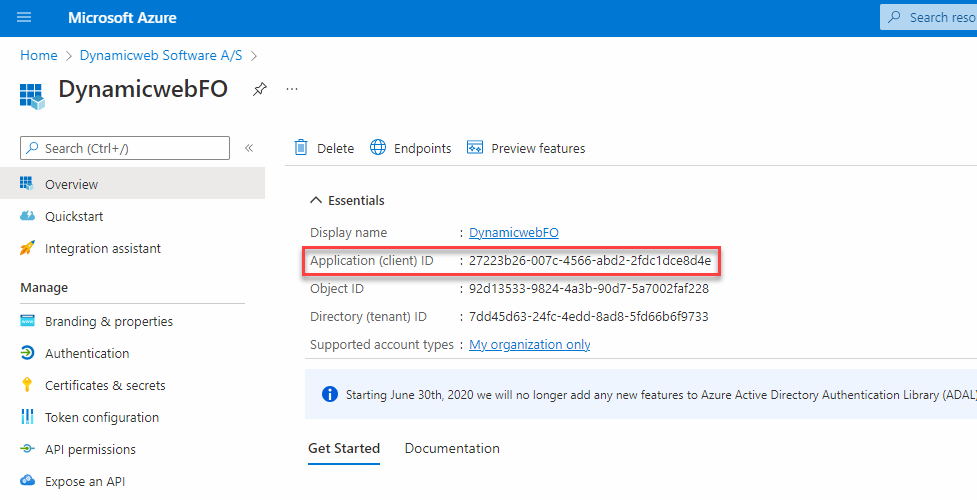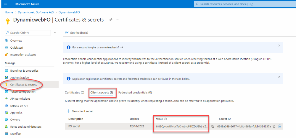 - Make sure to copy the value of the client secret at this point (not to be confused with the ID), as it will be hidden henceforth and is to be used in the authentication within Dynamicweb