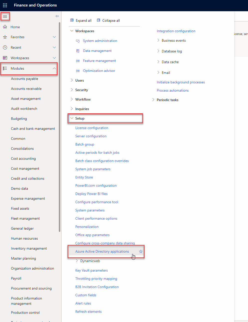 Finally, open the D365 FO instance in your browser and go to System administration – Setup – Azure Active Directory applications.