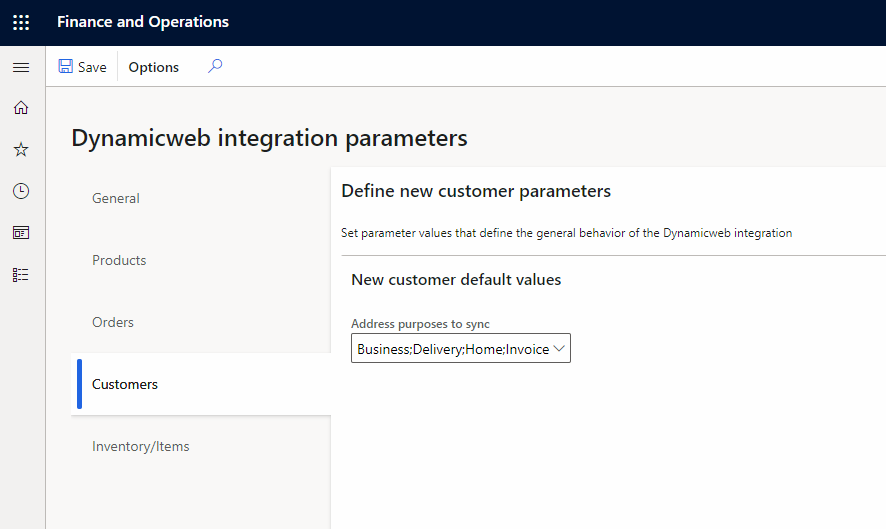 Used by the Customers export endpoint to specify which customer addresses should be export to Dynamicweb. Select one or more required purposes to exports, from the standard list of Ax address purposes (Organization administration – Setup – Global address book – Address and contact information purpose). |