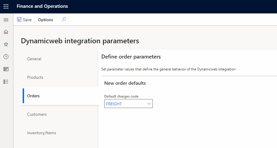 Used by the Sales orders import endpoint, if shipping charges are managed on the Ax side of the integration. If so, new shipping charge markup will be created using this code. Select a value from the standard Ax list of charge codes (Account receivable – Setup – Charges – Charges code). |