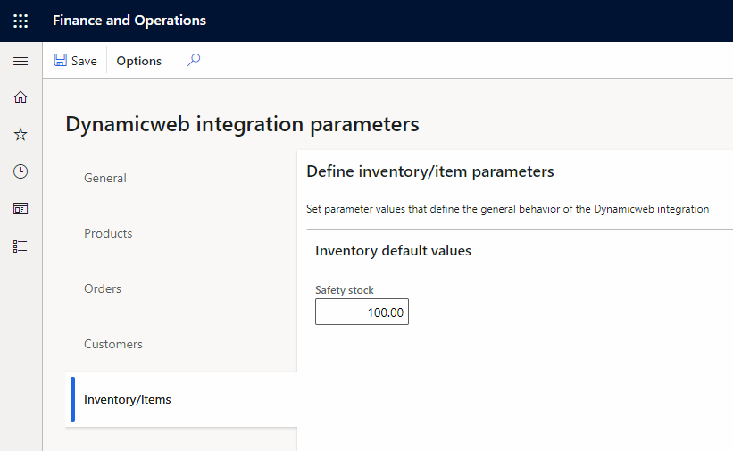 The Inventory/Item parameters are used to configure the behavior of the stock sync feature. They can be accessed from the Inventory/Items tab of Dynamicweb integration parameters form (Figure 24.1).