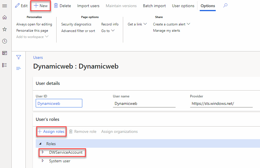 - Insert a suitable User ID and User name (fx. "Dynamicweb)
