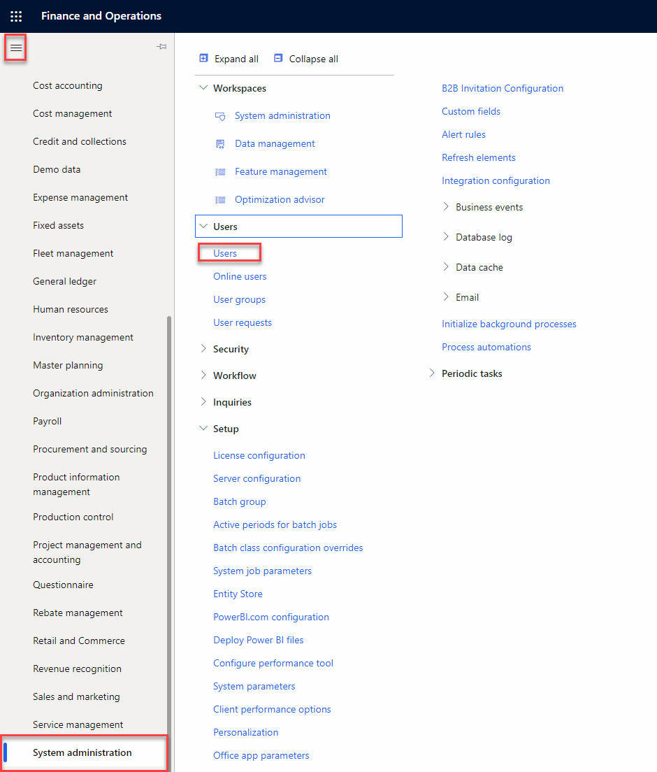 To do so, go to Modules > System administration > Users in Finance & Operations.