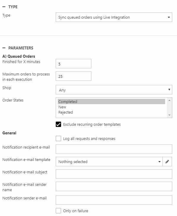 If, on the other hand, you disabled live integration to, say, decrease pressure on your remote system during business hours, you want your scheduled task to respect that also. In that case, you could schedule the task to run outside business hours once a day. Make sure you set “Maximum orders to process in each execution” to a high enough number so all new orders are transferred correctly.
