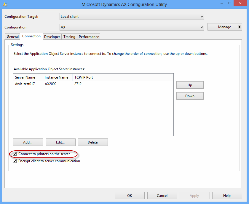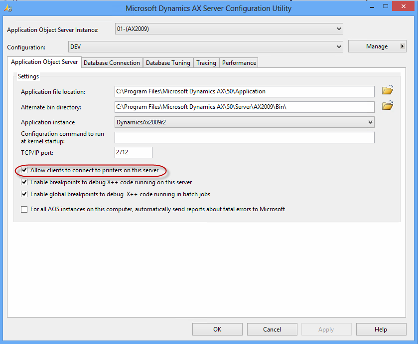 - Go to Control Panel\All Control Panel Items\Administrative Tools\. Run the Microsoft Dynamics AX 2009 Server Configuration utility. On the Connection Tab set the Allow clients to connect to printers on this server check box (Figure 2.2).