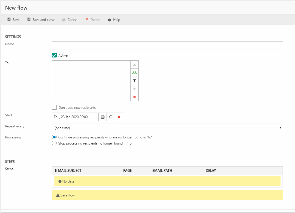 As such, an email flow is an essential part of an email automation setup – especially if the group of recipients is based on dynamic criteria via smart searches or user index queries.