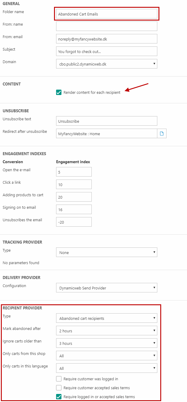 Since these types of emails need to have their content rendered for each recipient – because they have unique shopping cart contents – you should create and configure a separate folder for abandoned cart emails, as this will allow you to preselect a lot of necessary settings.