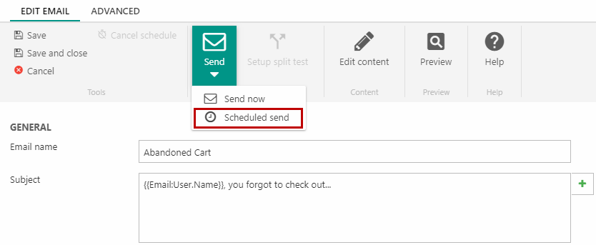 Once the abandoned cart email-page is to your liking, go to Marketing > Email Marketing and create a new email in your Abandoned Cart Emails folder.