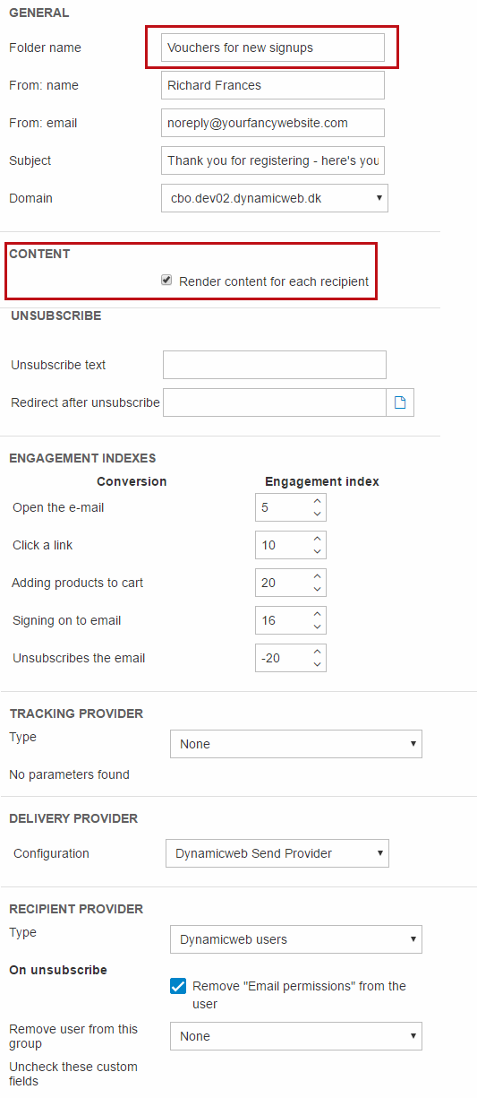 Since these types of emails need to have their content rendered for each recipient – because they have unique content for each user – we suggest you create and configure separate top folder for them.