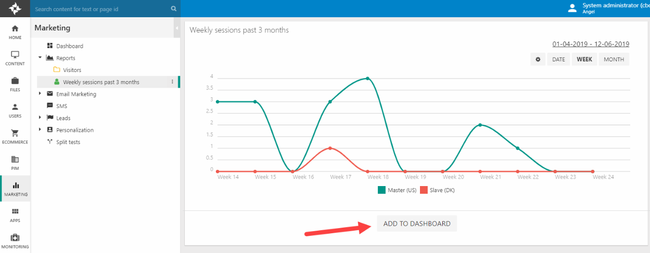 The Reports node allows you to generate various types of reports based on tracking information – e.g. weekly sessions per website, yearly sessions per platform, and so on. Once created, the report can be visited directly or exported as a dashboard widget to the marketing dashboard (Figure 1.1).