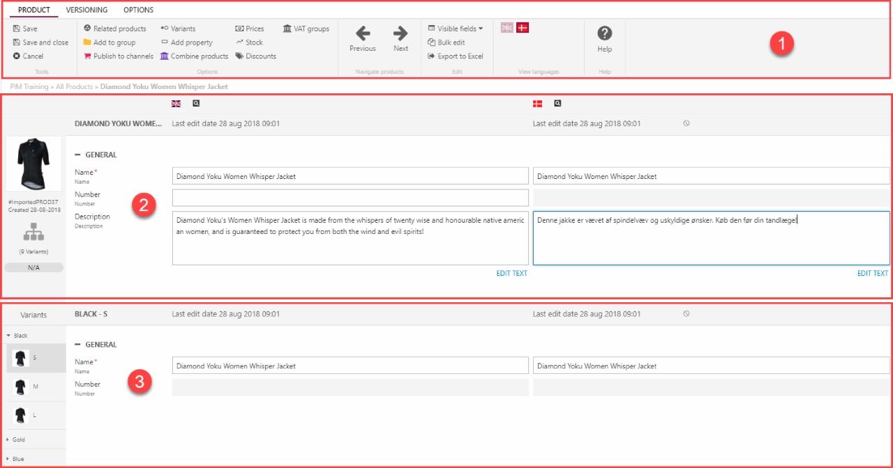 - If the product contains variants or family members these can be accessed using the variants menu (3)