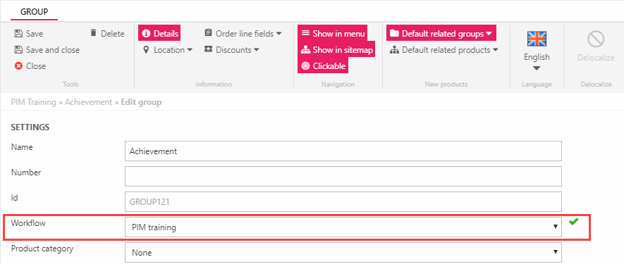 By default, all workflows can be selected - but you can limit the states available by selecting a particular workflow at the group level (Figure 1.2) - use the green checkmark to force the workflow value on all subgroups. If a product is a member of several groups with explicit workflows set, both workflows will be available when editing the product.