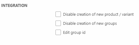 The Integration settings (Figure 13.1) are useful if you integrate with an ERP system e.g. NAV or AX. With the settings, you can limit the available actions from the Dynamicweb backend, to ensure that the ERP system has full control over your product catalog: