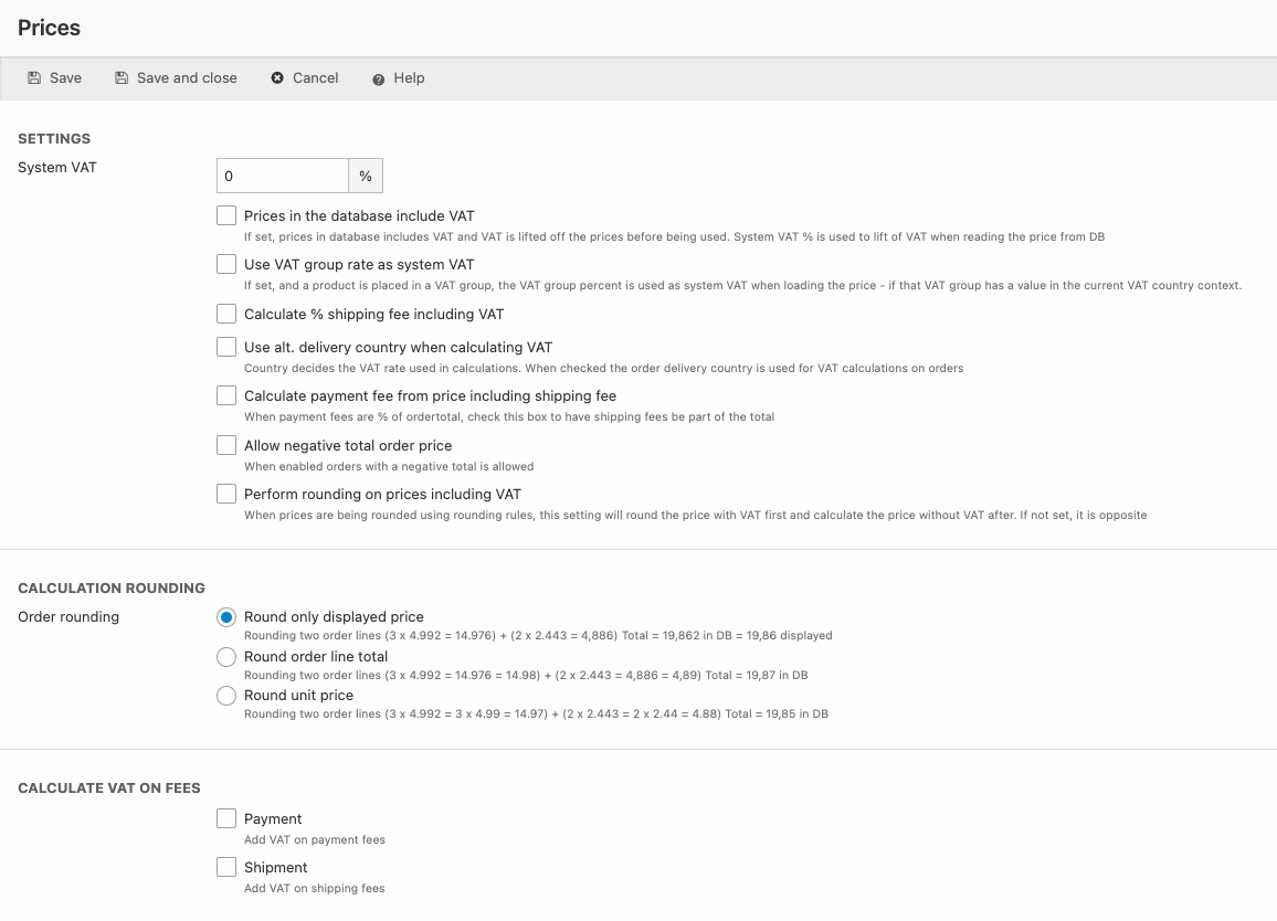 | Prices in the database include VAT | If set, prices in database includes VAT and VAT is lifted off the prices before being used. System VAT % is used to lift of VAT when reading the price from DB |
