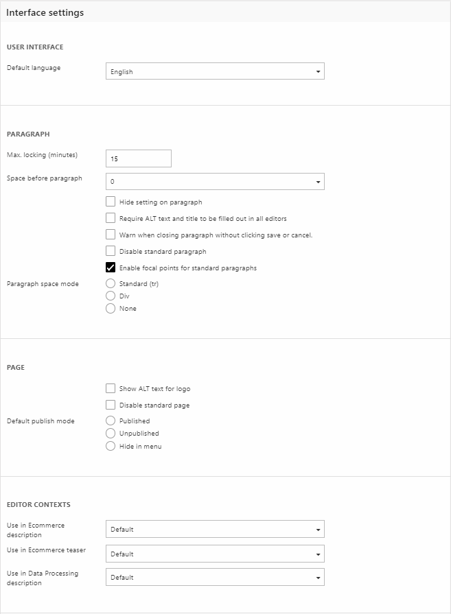 - Default publish mode – set a default publish mode for new pages; Published, Unpublished, or Hide in menu.
