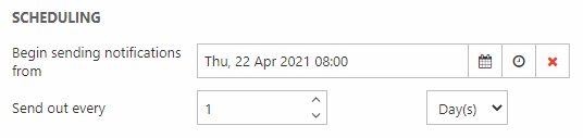 You can customize the send interval in days and the hours inbetween which you send the notifications.