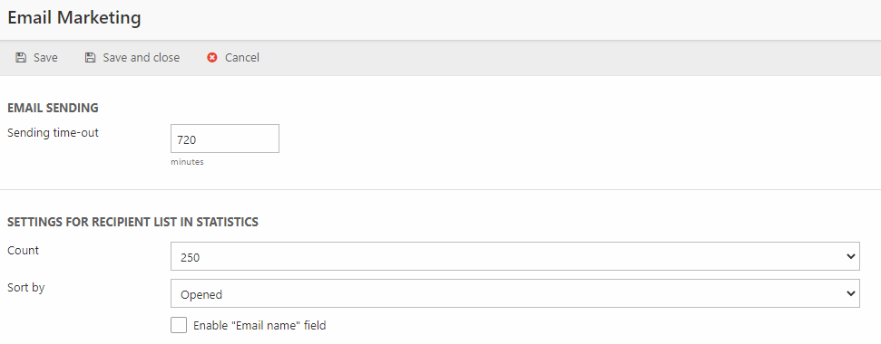 In the settings here, you can change the view of the recipient list in statistics and enable the Email name field which lets you give emails an internal name to use in the email list. You can also configure delivery providers.
