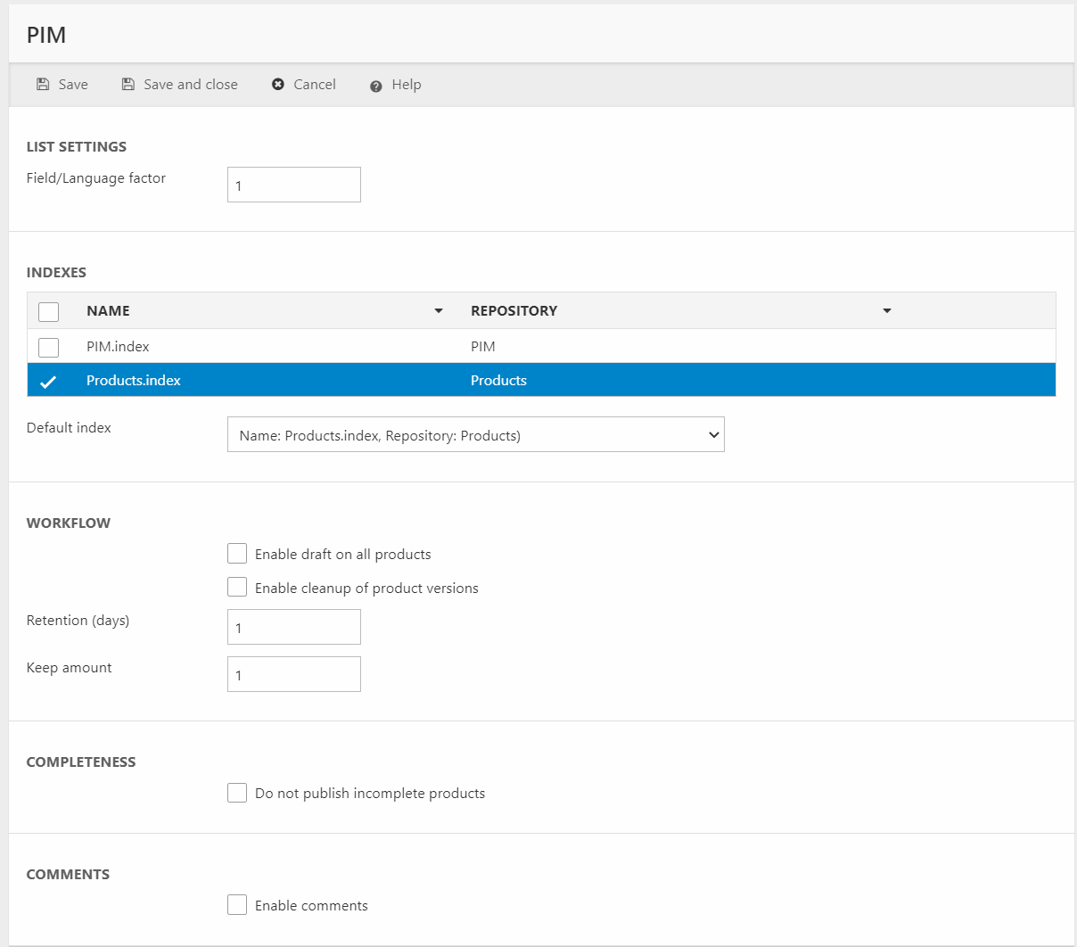 The General subnode contains basic settings associated with PIM, most importantly the setting for choosing a default index for PIM. This is the index which is automatically rebuilt whenever a product in PIM is saved.