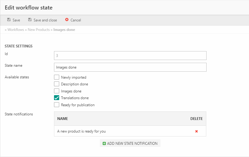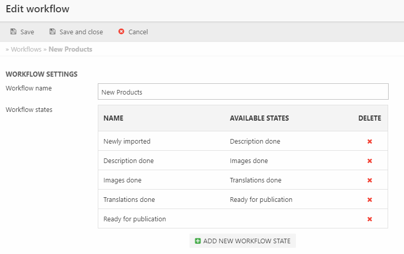 - A number of states – e.g. New product, Ready for description, Ready for translation, etc.