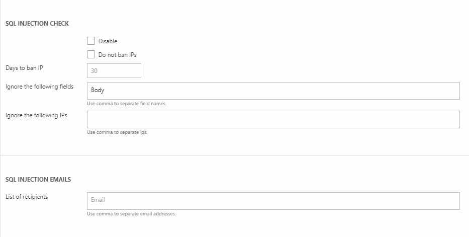 - Specify one or more emails to notify when an SQL injection attack is detected
