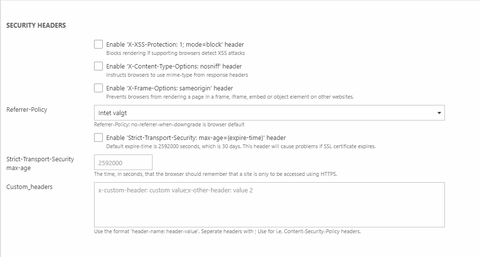 - Security Headers settings