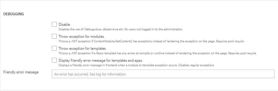 - Throw exception for templates – forces the system to throw .NET exceptions instead of rendering the Razor exception on the page