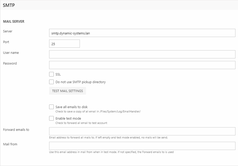 - Enable test mode - forwards all emails sent from the solution to the address specified in Forward emails to field. The From email can be set using the Mail from field.