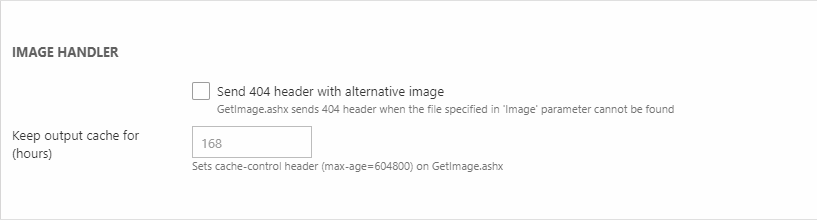 The Image Handler settings (Figure 7.3) control for how long the output cache from the Image Handler tool should be saved (in hours) . The default is 168 hours (one week).