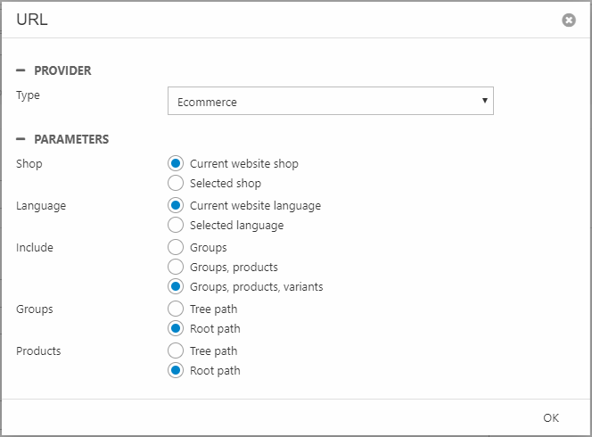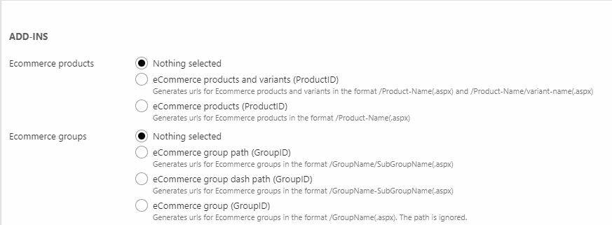 When using the Ecommerce add-ins, you can configure how URLs for product groups and products are generated (Figure 3.1).