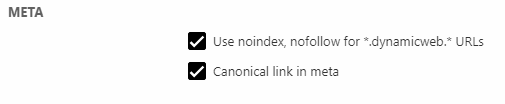 You can check Use noindex, nofollow for *.dynamicweb.* URLs to tell search engines NOT to index or follow links to Dynamicweb.dk domains. If disabled on *.net.dynamicweb.dk solutions, you will still get a <meta name="robots" content="noindex,nofollow"> in the page source on your *.net.dynamicweb.dk addresses. This is intended behavior. Dynamicweb cannot have pages indexed ending with .dynamicweb.dk or any other Dynamicweb domain, as it breaks SEO for our own Dynamicweb page. You need to buy a domain for your solution.