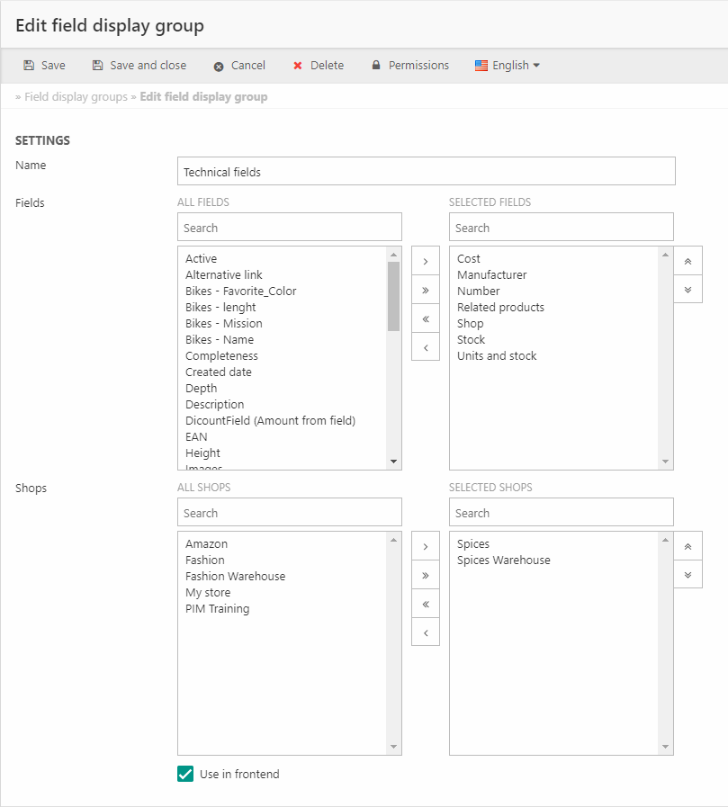 - Select which shops/warehouses/channels the field display group should be available for