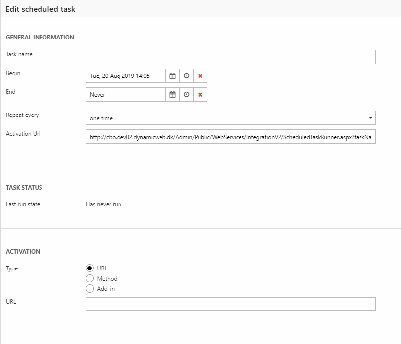 Here you can define the task name, the start time and end time, and the repetition interval, and you can see the Activation URL, which can be used to trigger the scheduled task remotely.