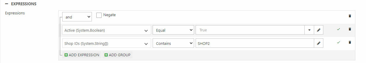 Queries are created by stringing together a set of expressions – as in Figure 3.1 where we’re asking for all products which are Active and in SHOP2.