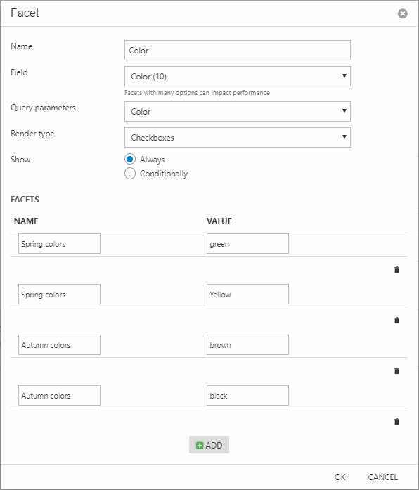 - A list facet lets you group field values under a common label (“Spring colors”)