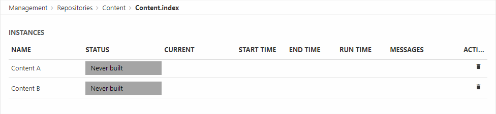 Once you’ve added instances, a build configuration, and a set of fields to the index you should build it – to do so click a yellow button with an instance name on it (Figure 5.1).