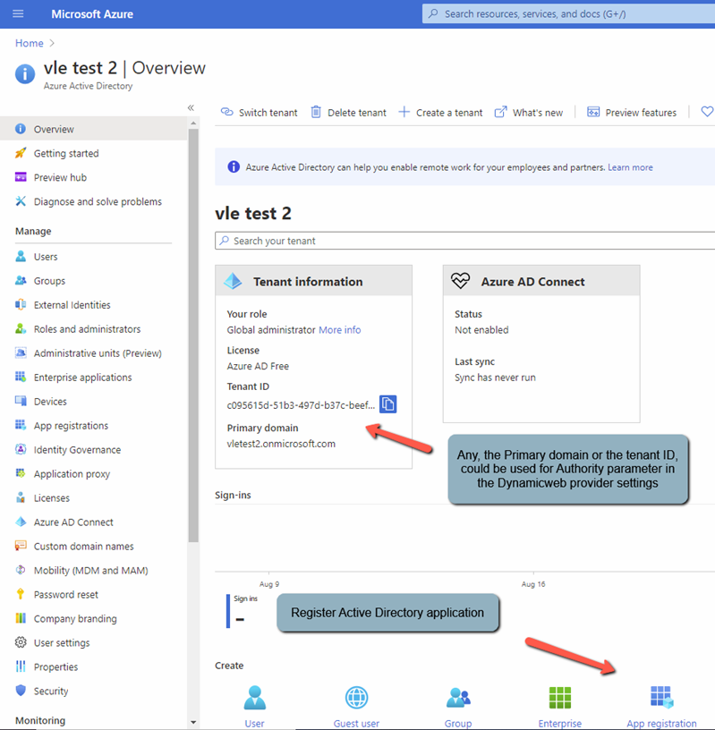 - After the tenant has been created, click Continue to go to the Active directory Overview page. Copy the tenant ID or primary domain and store it somewhere, as you will need it when setting up the Dynamicweb login provider.