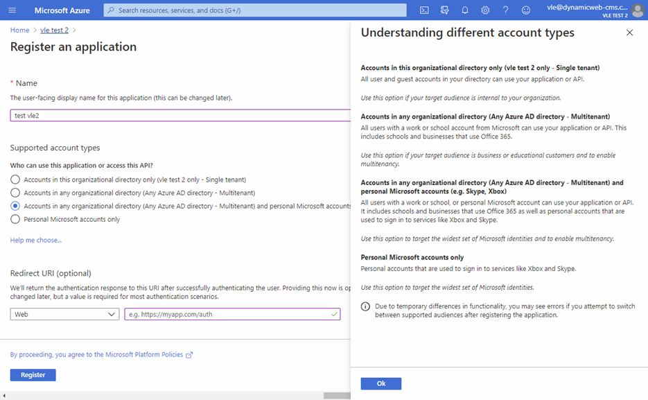 - Next register an Application – basically creating an API key for a service to connect to Azure AD. Make sure you select an appropriate account type as you cannot change it later on.