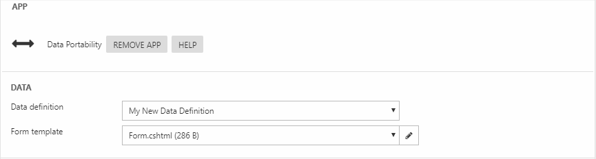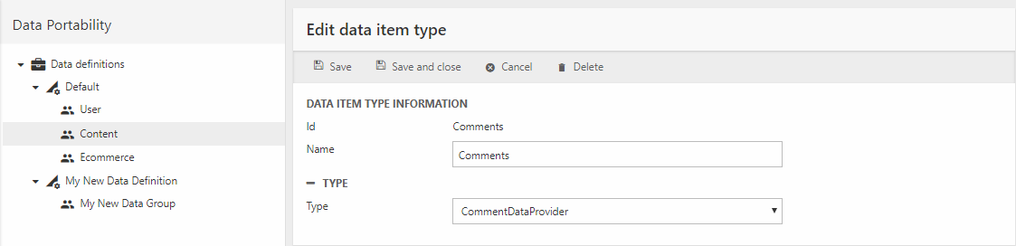 A data definition can contain of as many data groups as necessary – each data group can be viewed as a rough grouping of related data, e.g. Content data such as comments, form submits, and forum messages. This data is retrieved by data item types using a data-specific provider.