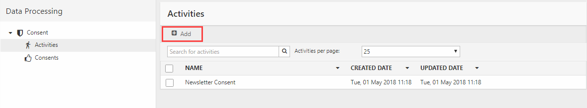 An activity is a convenient way of creating clear, concise and granular opt-in categories – e.g. Consent to receive email newsletters. Activities will always be specific to your business and data flow.