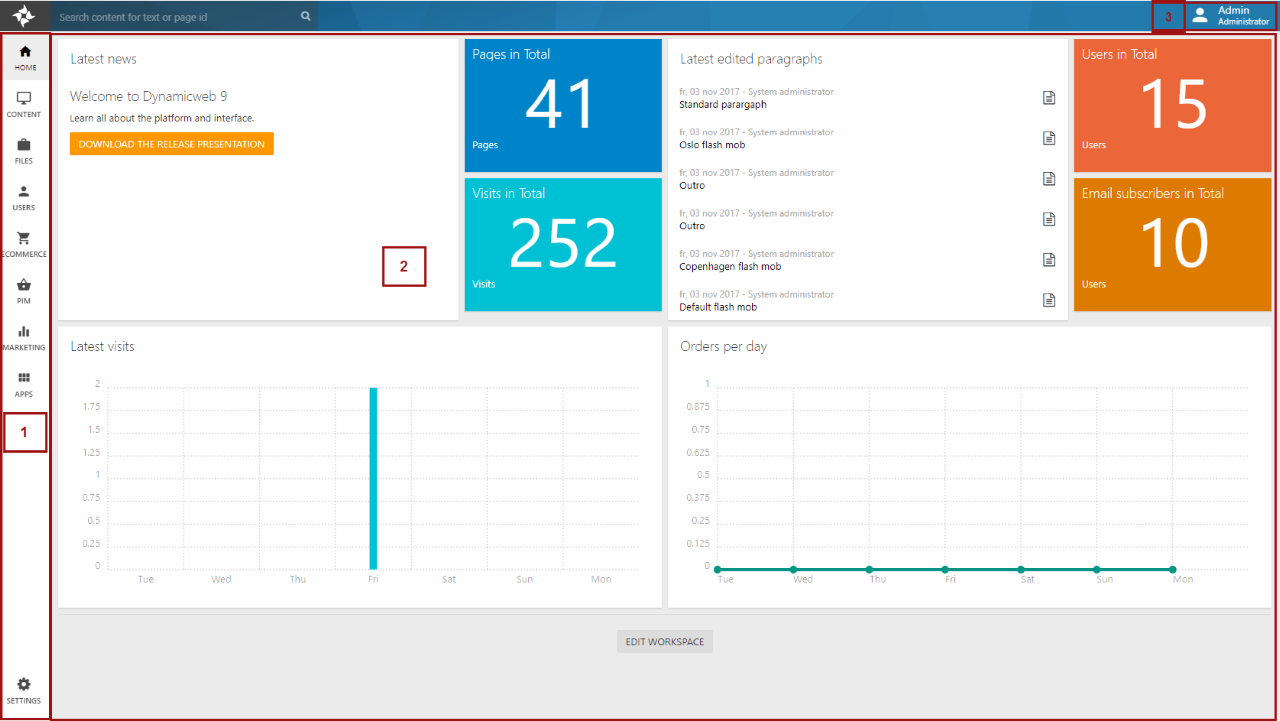 Once you have logged in, you will see the Dynamicweb administration interface, also referred to as the backend (Figure 2.1).