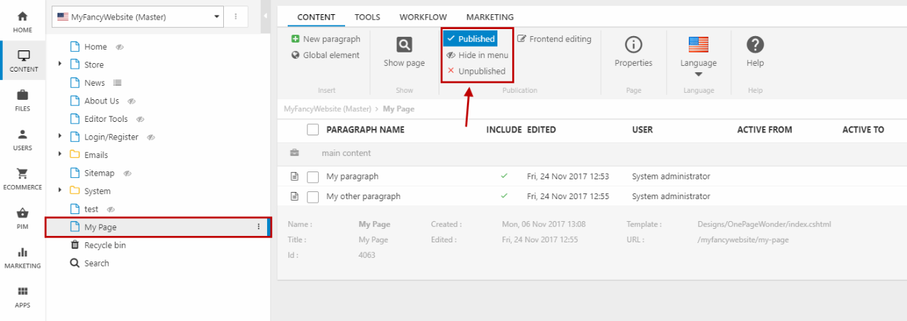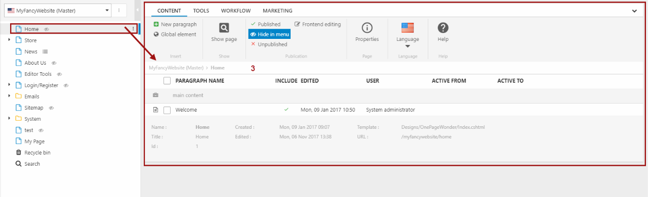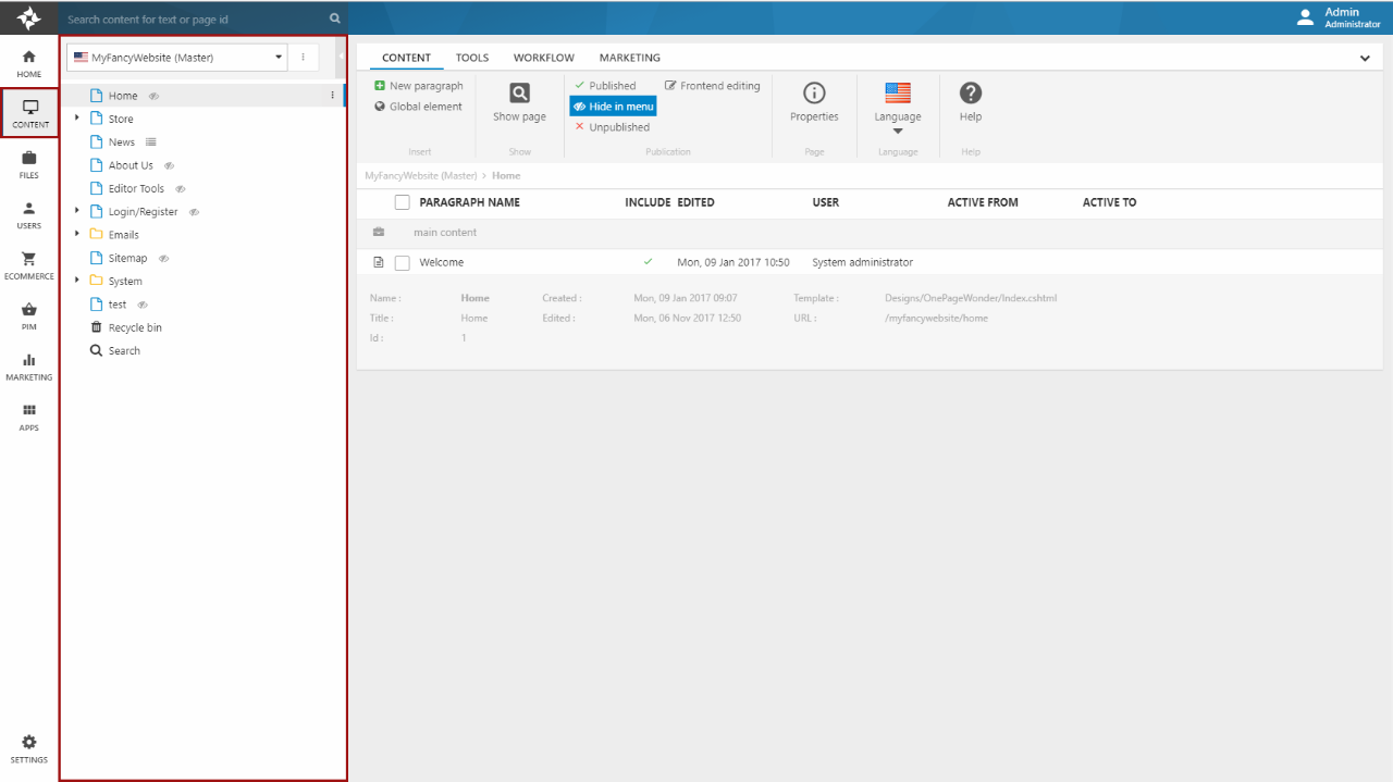 As you can see, the website MyFancyWebsite contains a number of pages e.g. Home, Store and News. When the page Home is selected, its content is shown in the Content page. This page contains a single paragraph called Welcome.