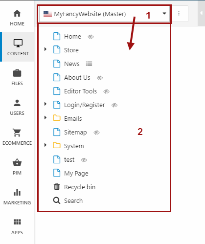 - At the top of the Content tree is a dropdown menu with all of your websites (1). Select the website you want to create/edit pages and paragraphs for.