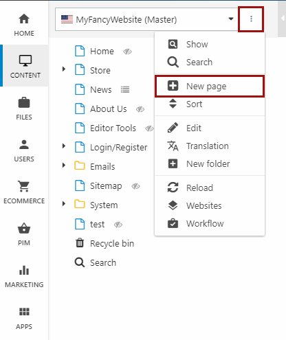 To create a new page, open the Content tree menu and click New Page (Figure 4.1).