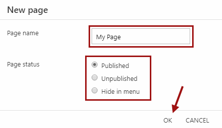 - Choose whether you want your new page to be published, hidden in menu or unpublished (Figure 4.2)