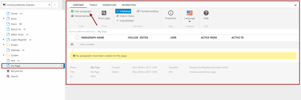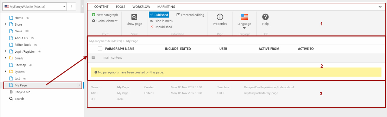 To work with pages and paragraphs click the Content area to open the Content tree (Figure 3.1):