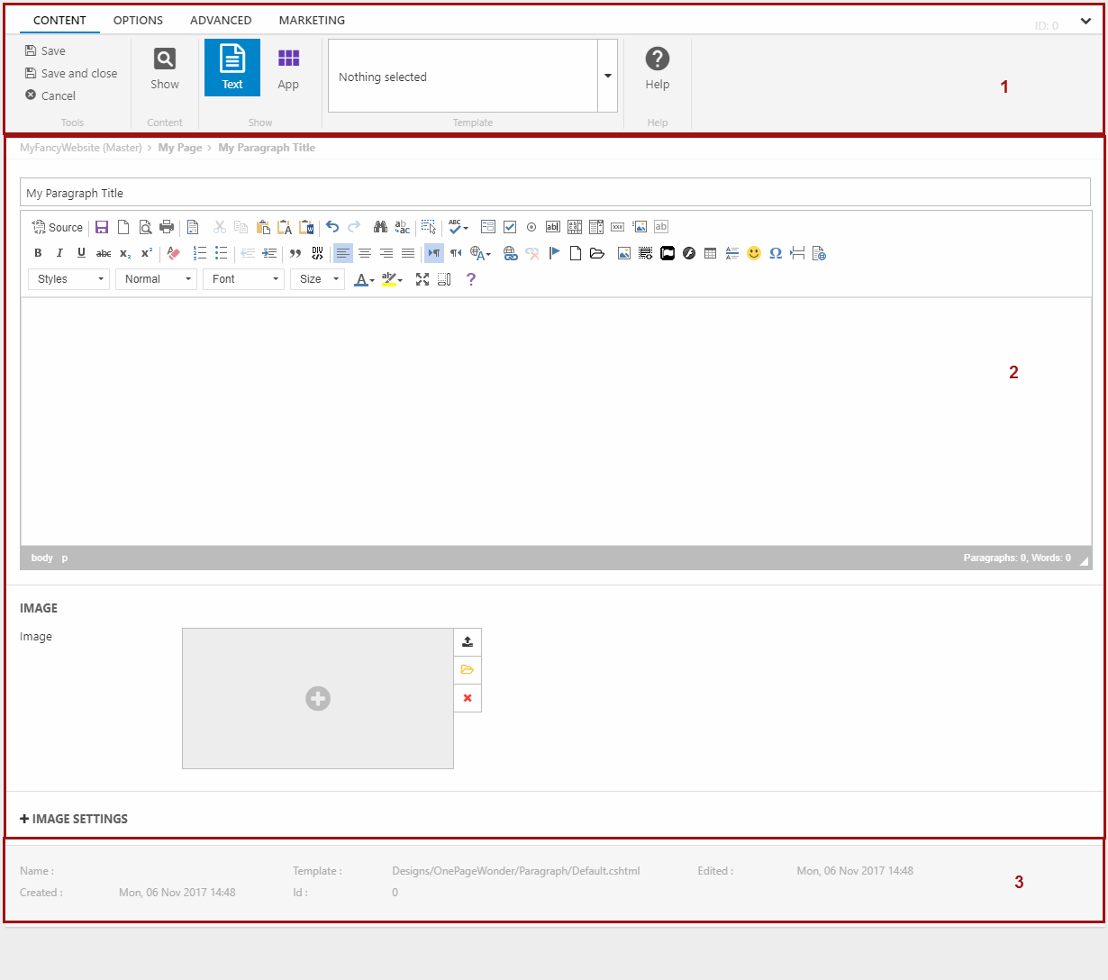 - An empty paragraph list (2) – this is where you add and organize the paragraphs containing your content. Notice the Content-header – this is a content placeholder. Content placeholders are used to organize paragraphs.