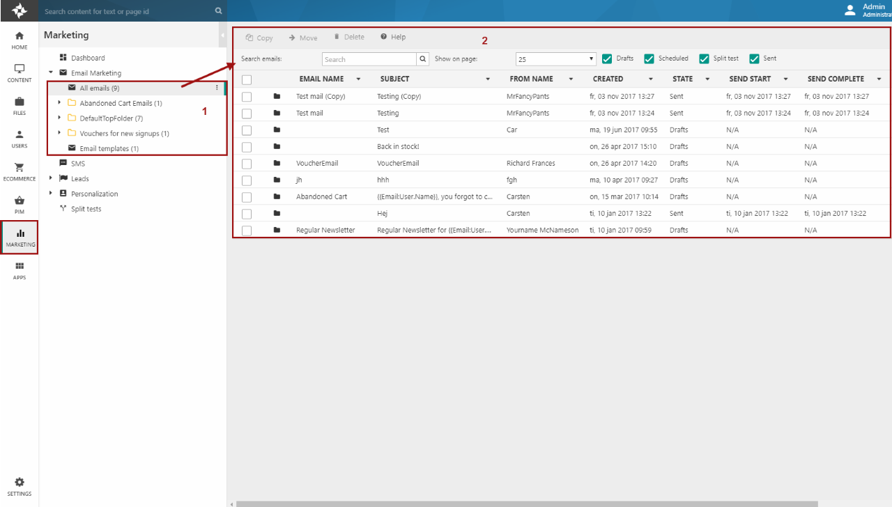 - Click any of the email folders, e.g. All emails - this opens the email list (2) with useful short information about your emails.