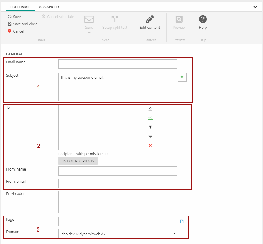- Give the email a name (internal name) and subject (what people will see in their mailbox) (1)