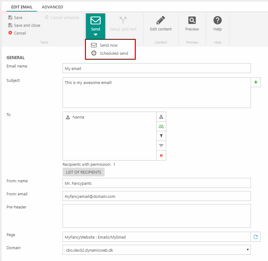 Here you can choose the time and date to send the email and choose if the email should be sent repeatedly e.g. every month. When you’re done, click Schedule.