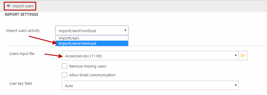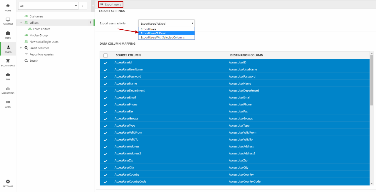 - Choose ExportUsersToExcel as export users activity to create an Excel Worksheet file with the users
